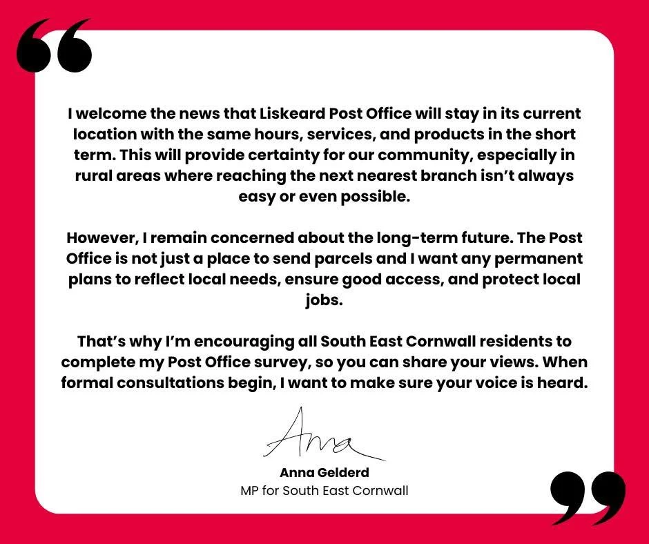 Importantly, Liskeard Post Office will remain in its current premises, with the same opening hours, services, and products. This provides short-term certainty and stability for our community, which is especially important in rural areas like ours, where reaching the next nearest branch isn’t always easy or even possible.
